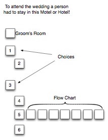 I was looking at squares that had to do with renting or staying in a room in a motel/hotel to go to a wedding. People going to the wedding had to get a room in this place. I did not see the whole picture at first and was looking at the top two or three squares.  I have numbered the squares representing rooms in the motel/hotel for clarity, except for the Groom’s room.  As I looked at the two or three top squares I was shown the top square was the Groom’s room and no one else could stay in it. Only He could.  I was shown that if a person chose to get room 1, then box 2 and what it represents having to be done came with it, there was no choice in the matter! The scene scrolled down and I saw number 3, knowing it was a room a person could choose if they wanted to take it instead of room number one.  The scene was still scrolling down through all of this and I saw the vertical line of boxes, knowing that if a person chose to stay in the number 3 room that boxes 4, 5, and 6 and the requirements in them came with it. There was no choice in the matter! Then I saw the whole picture, including the squares to the right of number 5, and knew that if a person took the number one room everything below it, boxes 2,4,5,and 6 came with it.  In the scene I was told the line of square boxes was the Flow Chart.  At this point, I said, “Whoa!  There is more to this than a scene of renting rooms for a wedding.”