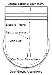 In the scene the group was seated out on the floor (audience with God) of a huge throne room. Around the edge were other groups behind the main floor (talking and doing their own thing - no audience with God). I saw our watchman get up and walk towards the throne - going up the steps to the throne for instruction.