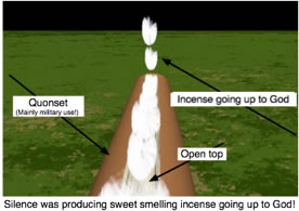 On Wednesday, October 22, 2008 I had a scene in the night that revealed silence produces sweet smelling incense.  I was inside a Quonset filled with single chairs and some people.  From the silence inside there was sweet smelling incense going up to God through a long opening in the roof.  I have pictured this on top, from the outside of the Quonset.
