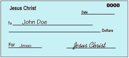Years ago when the Lord started dealing with me about this, He kept repeatedly showing me checks in the night.. These checks were all signed by Him and in the upper left-hand corner where the account owner is designated was the name "Jesus Christ." In the lower left corner where you have a memo of what the check is for, it also said "Jesus ." I did not understand all of this and it took quite sometime for me to realize what the Lord was really saying. These checks were all made out to various people for various amounts; but all the information, the signature, the account that it was from, and its purpose, was for "Jesus." At first I was wondering why none of these checks were made out to me, since I was a believer. I was disappointed. Obviously I had the wrong mind-set. But as I began to see the picture, I became extremely excited in my spirit!